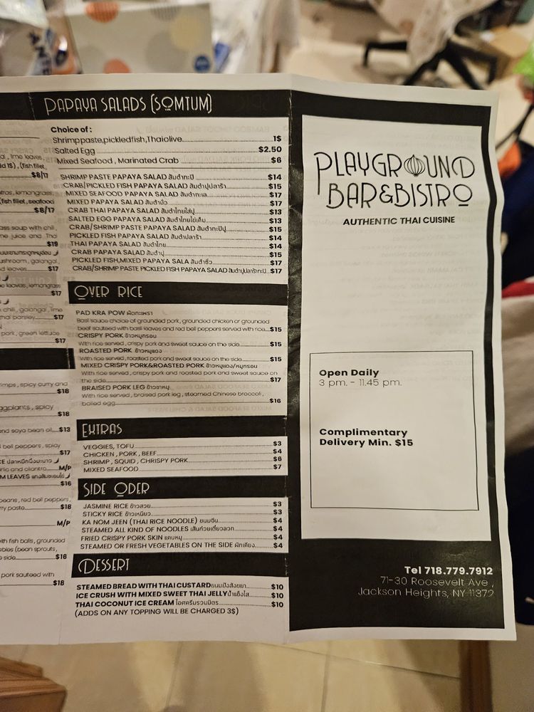 Play Ground Thai Restaurant in Jackson Heights, NY offers a flavorful and authentic taste of Thailand. With a cozy and inviting atmosphere, this restaurant is perfect for a romantic date or casual night out. The menu boasts a variety of appetizers, special dishes like Phuket Grilled, and delicious soups like Tom Yum Kung. Customers praise the bold and vibrant flavors, large portions, and excellent customer service. The dishes are made with fresh, high-quality ingredients, with options for both spicy and milder palates. From the attentive servers to the mouthwatering aroma of the food, Play Ground Thai Restaurant stands out as a hidden gem worth exploring. Whether you're a fan of Thai cuisine or looking to try something new, this restaurant promises a delightful culinary experience.